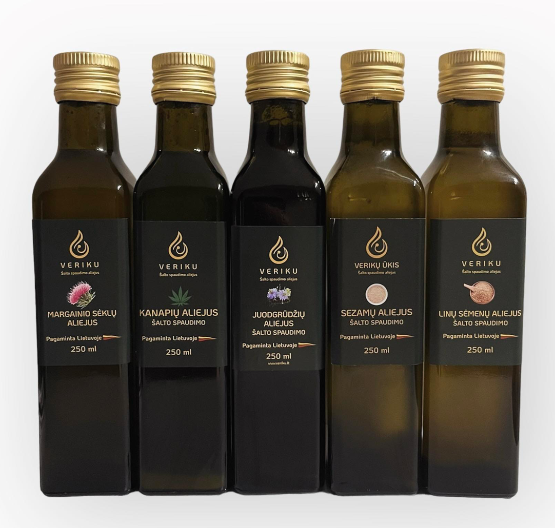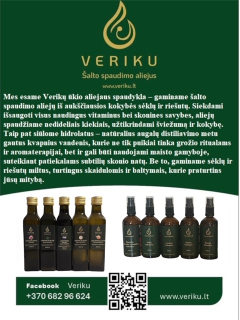 Mes esame Verikų ūkio aliejaus spaudykla – gaminame šalto spaudimo aliejų iš aukščiausios kokybės sėklų ir riešutų. Siekdami išsaugoti visus naudingus vitaminus bei skonines savybes, aliejų spaudžiame nedideliais kiekiais, užtikrindami šviežumą ir kokybę. Taip pat siūlome hidrolatus – natūralius augalų distiliavimo metu gautus kvapnius vandenis, kurie ne tik puikiai tinka grožio ritualams ir aromaterapijai, bet ir gali būti naudojami maisto gamyboje, suteikiant patiekalams subtilių skonio natų. Be to, gaminame sėklų ir riešutų miltus, turtingus skaidulomis ir baltymais, kurie praturtins jūsų mitybą. Mūsų produkcija – tai natūralios ir sveikos gyvensenos dalis.